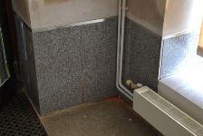 - Die untere Leiste ist daher als Doppelleiste ausgeführt (analog der Leiste für die Innensanierung, jedoch noch mit einer L-förmigen Leiste, die durch Punktschweißung über Abstandhalter einen Entlüftungskanal bildet). Somit kann auch selbst bei salzgestreuten Gehsteigen kein Salz mehr ans Mauerwerk gelangen. Um ein Wackeln der Platten in den Schienen zu vermeiden und vorne einen korrekten Abschluss der Platten mit den Edelstahlleisten zu haben, wird an der unteren Leiste oberhalb der Schraubbefestigung ein einseitig klebendes Schaumstoffband (wie es auch für die Fensterabdichtung genommen werden kann) auf die Edelstahlschiene vor dem Einschieben der Platten aufgeklebt. Die Dicke des Schaumstoffbandes richtet sich nach der dicke des verbliebenen Spaltes zwischen Edelstahlschiene und Platte.